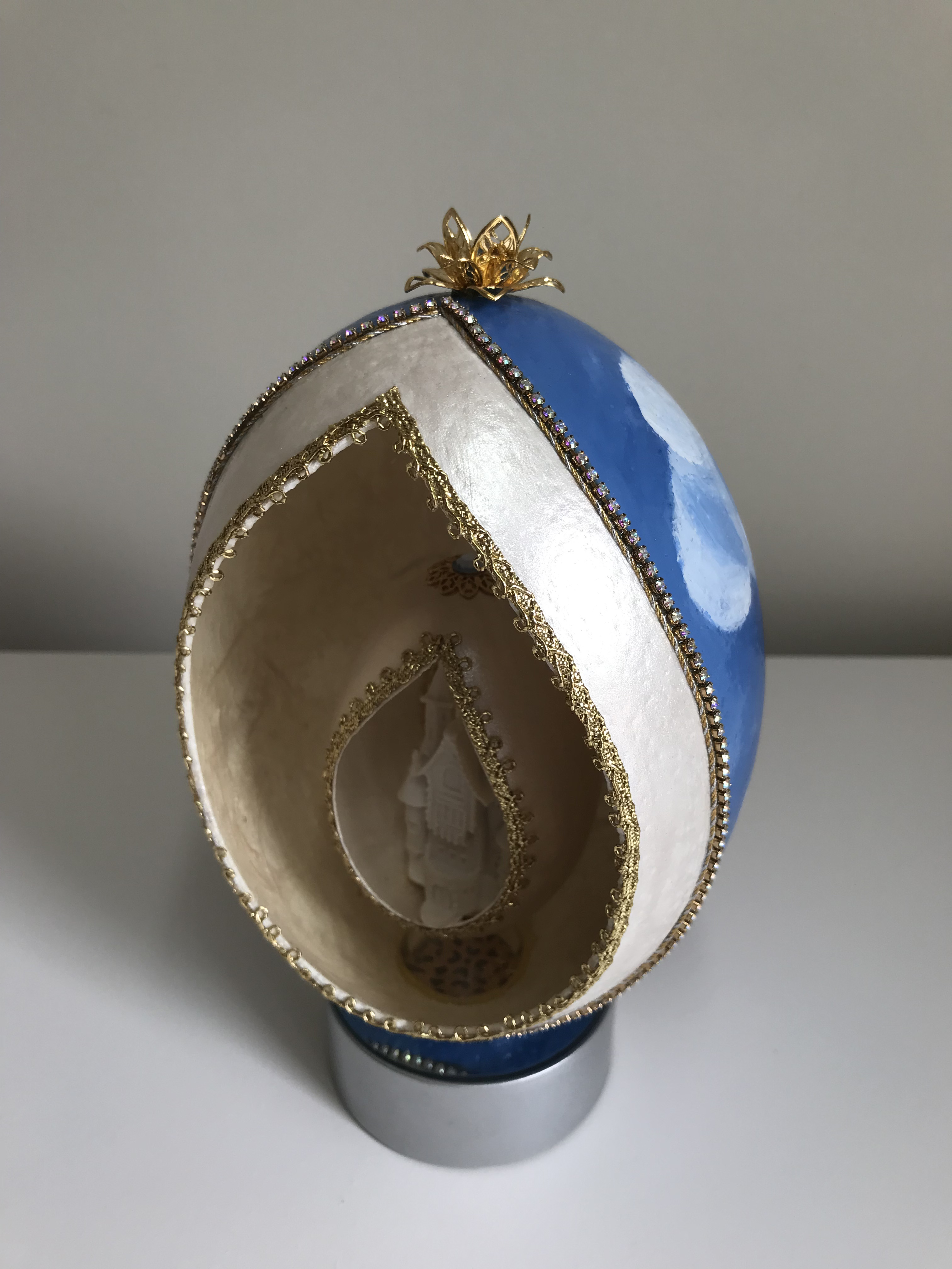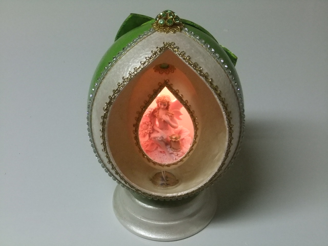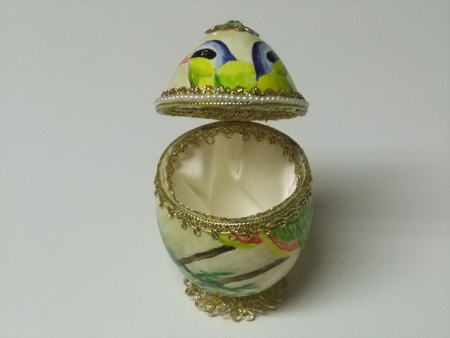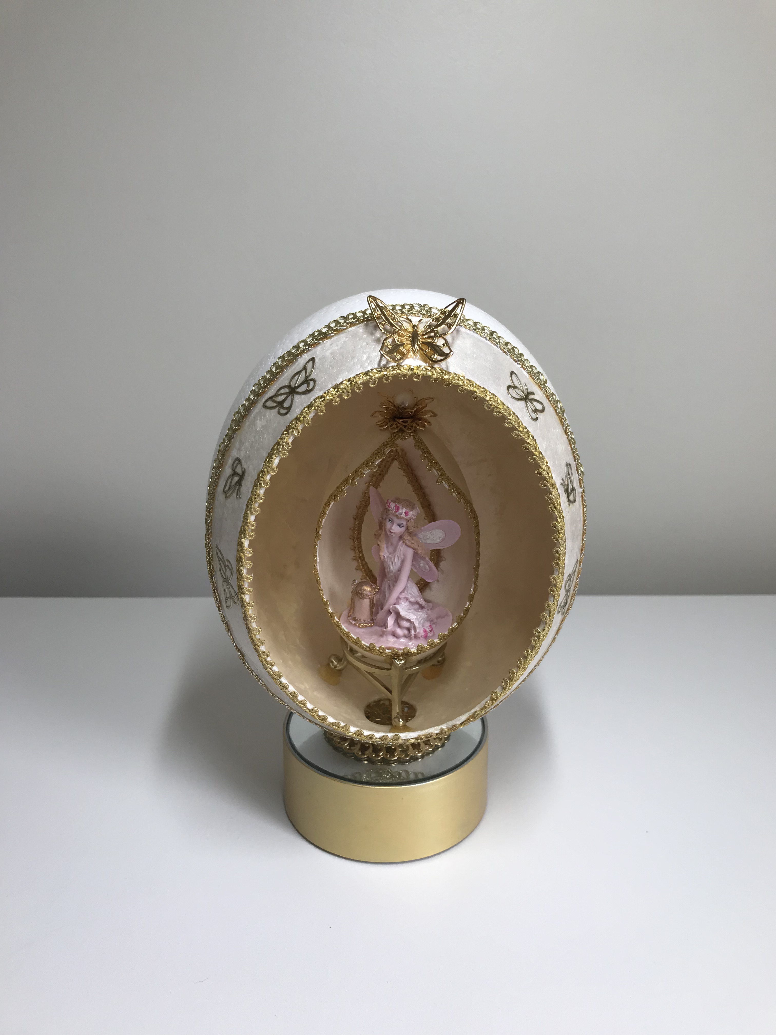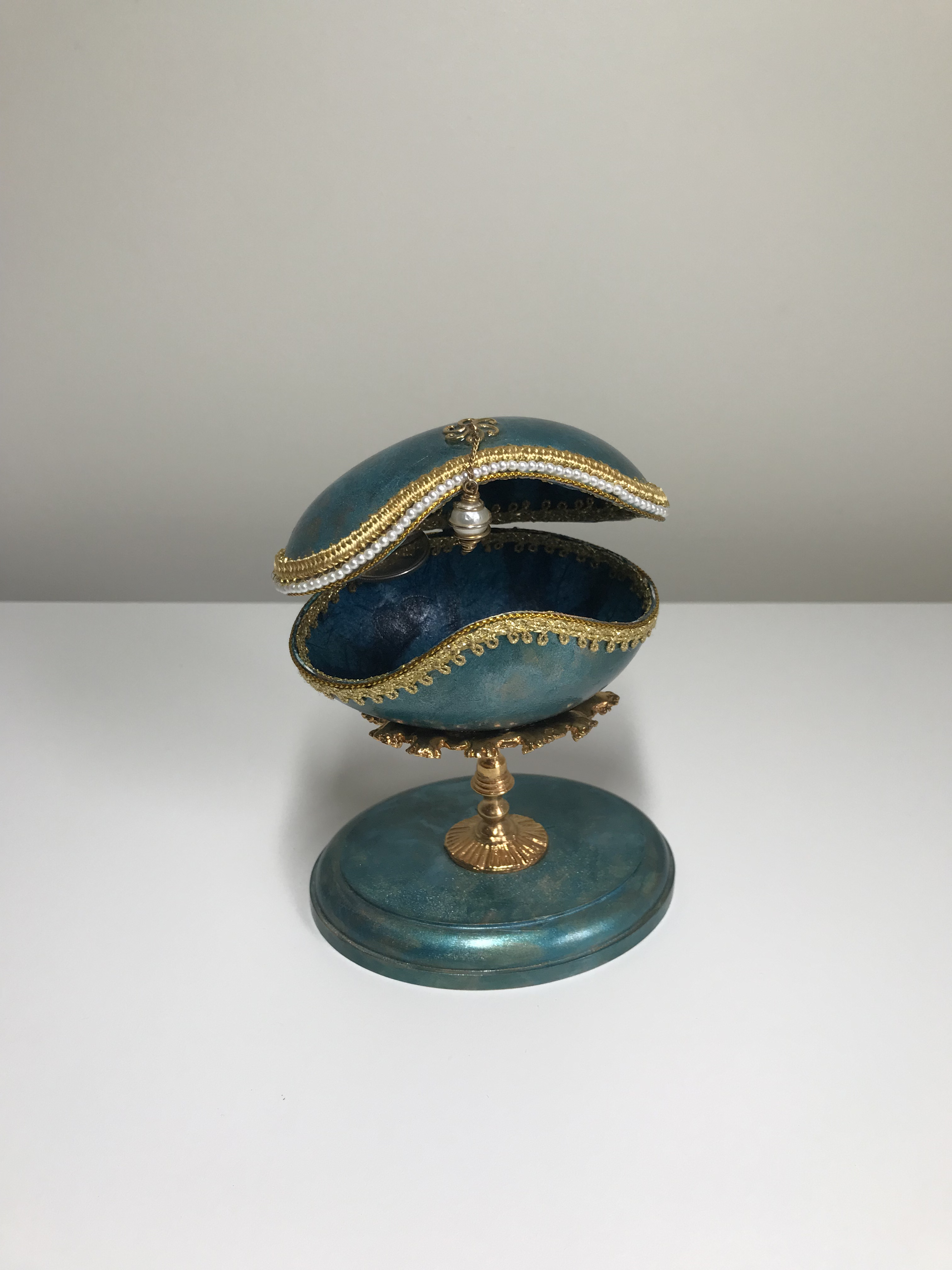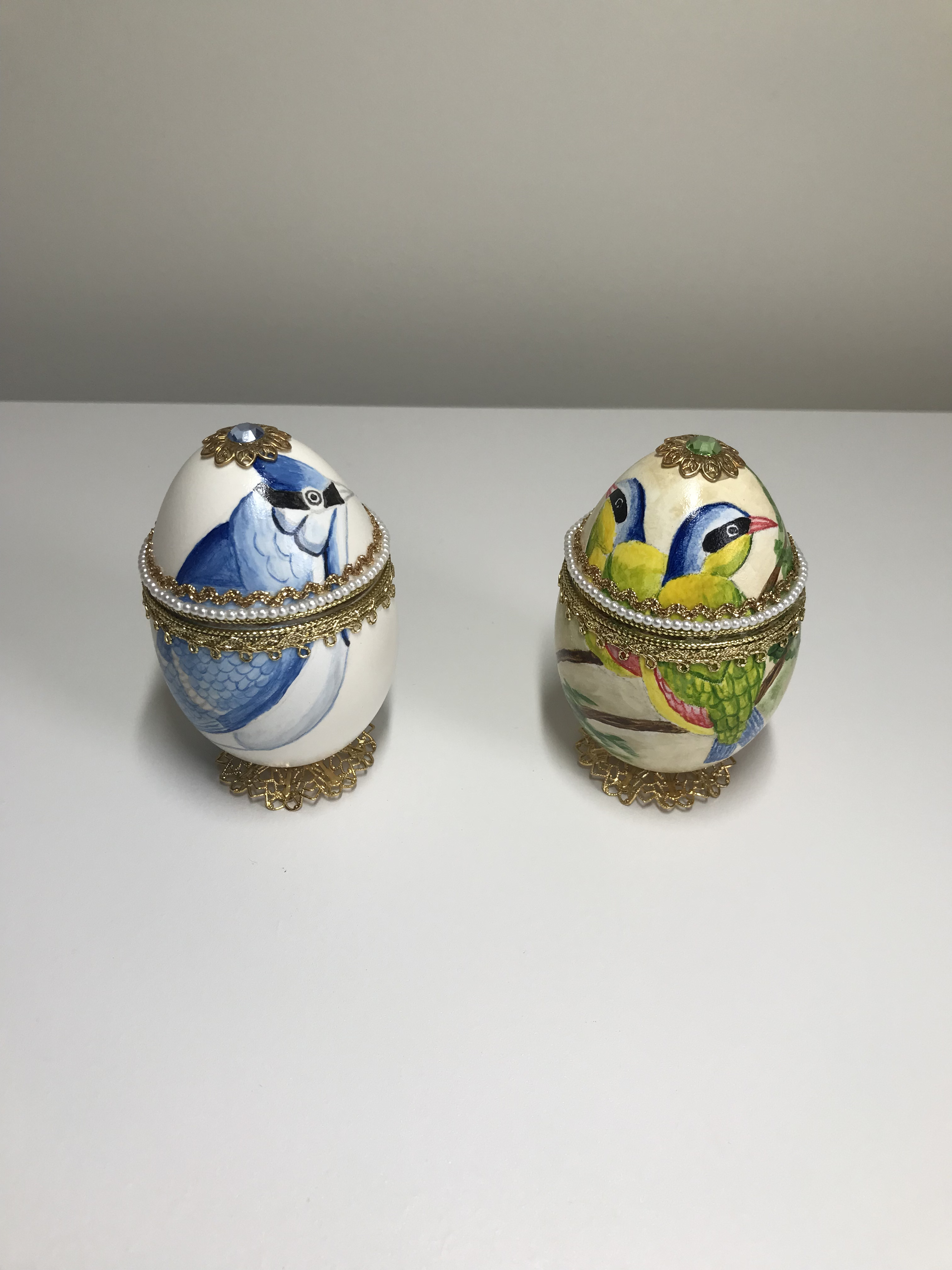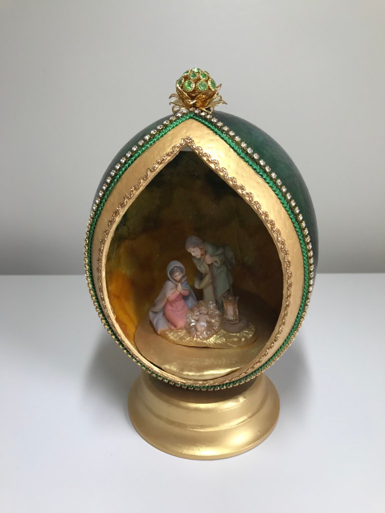 Coquilles Horloges : 65$ Lampes : 120$ Crèches : 65$ – 125$ VENDU Coffret à bijoux : oeuf d’émeu 65$, oeuf d’oie 45$